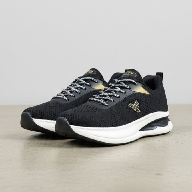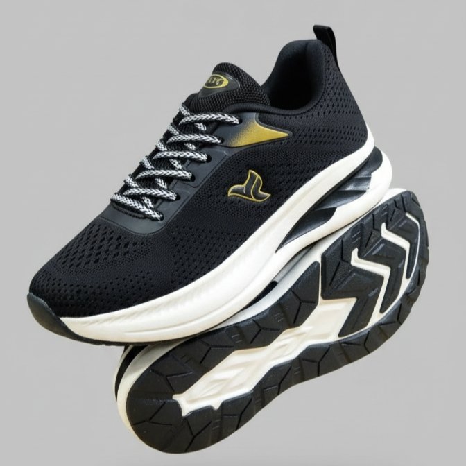 Yeh FLYO ke premium black-gold running shoes stylish design aur exceptional comfort ke saath aate hain. Breathable mesh upper airflow ensure karta hai, jisse feet cool aur fresh rehte hain. Lightweight cushioned sole smooth walking aur running experience deta hai. Gold accents inhe modern aur sporty touch dete hain, jo daily wear ya workout outfits ke saath perfect match bante hain.