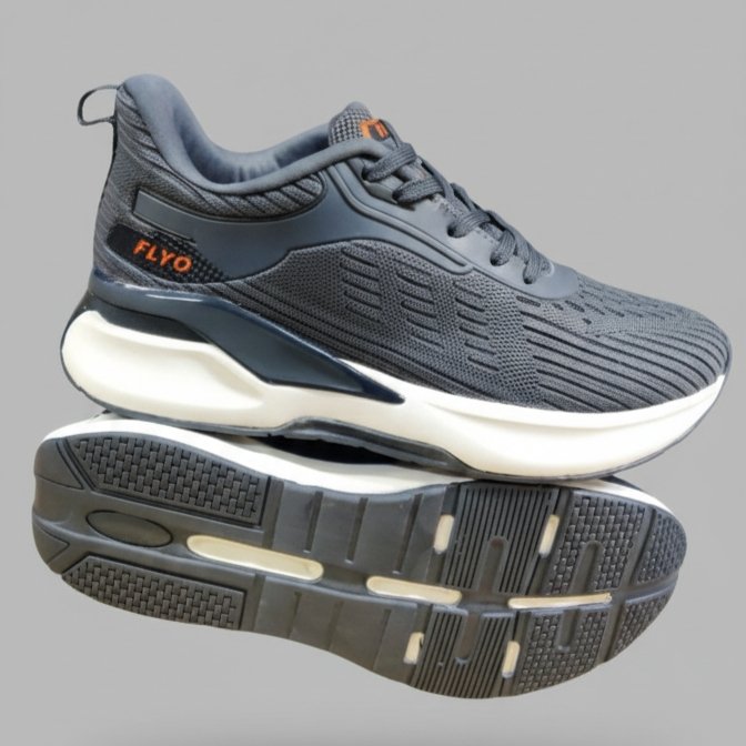 Yeh FLYO ke grey running shoes modern sporty design aur high comfort ke saath aate hain. Breathable knit upper airflow provide karta hai jisse feet cool aur sweat-free rehte hain. Thick cushioned midsole walking aur running ke dauran extra support aur shock absorption deta hai. Durable outsole strong grip ensure karta hai, jo daily wear aur outdoor use ke liye ideal banata hai. Grey color ke saath subtle orange detailing isko stylish aur premium look deti hai.