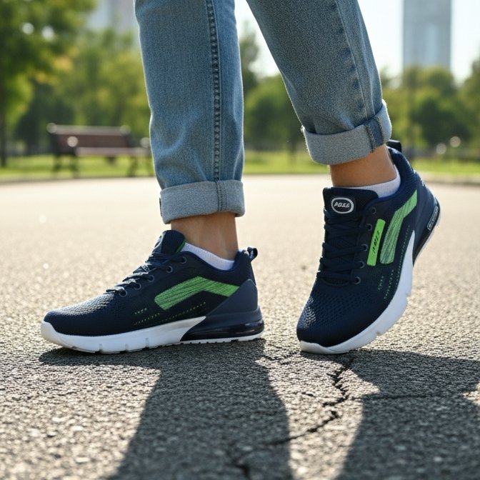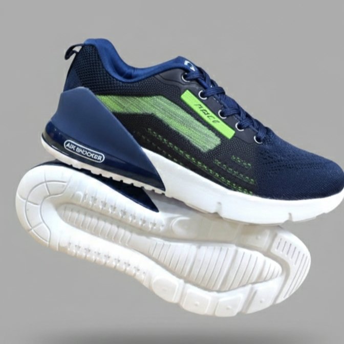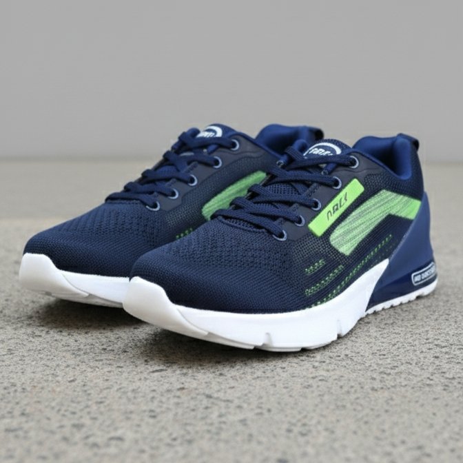 Yeh FLYO ke navy running shoes modern sporty design ke saath extra comfort aur stability provide karte hain. Isme air shocker heel technology lagi hai jo walking aur running ke dauran impact ko absorb karke smooth feel deti hai. Breathable mesh upper feet ko cool rakhta hai aur lightweight sole all-day comfort ensure karta hai. Green detailing iska look aur bhi attractive banati hai.