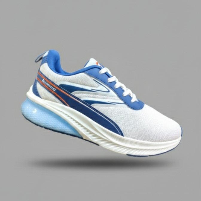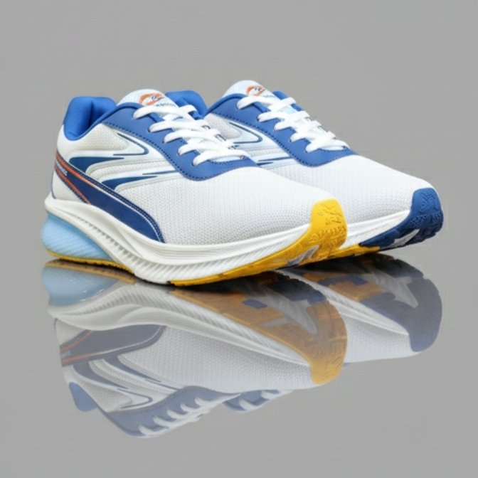 FLYO ke ye **white & blue air-cushion sports shoes** style aur comfort dono ka perfect combination hain. Iska **breathable mesh upper** aapke pairon ko fresh aur cool rakhta hai, jabki **air-cushioned sole** running aur walking ke dauran shock absorb karke soft aur smooth comfort deta hai. Yellow outsole aur blue detailing isse ek energetic aur sporty look deti hai — perfect for gym, sports aur daily wear.