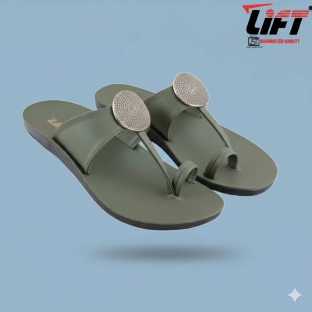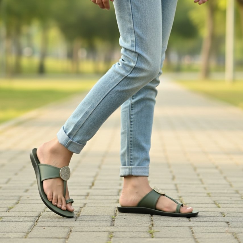 Ye elegant green ladies sandal soft cushioned footbed aur ergonomic toe-ring design ke saath aati hai, jo chalne me perfect comfort aur grip deti hai. Upar ka shiny round stud isko premium, classy aur fashionable look deta hai. Lightweight, durable aur daily wear, office, market aur casual outing ke liye ideal choice.